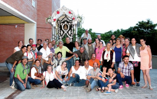 Fotografía 4. Hermanos y hermanas de la Hdad. Ntra. Sra. del Rocío Los Romeros posan ante la carreta del Simpecado tras finalizar el camino de vuelta del Rocío. Hasta 2016 lo realizaban andando, una de las pocas hermandades que lo hacían. Tras el traslado de la Romería a Terrassa ya no es posible.