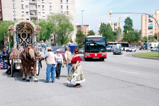 Fotografía 1. La la Hdad. Ntra. Sra. del Rocío Los Romeros comienza el camino por las calles de Barcelona el viernes por la tarde después de la misa en la parroquia de San Francisco Javier de Nou Barris.