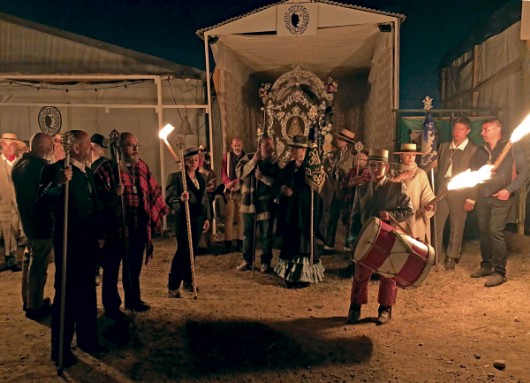 Fotografía 3. Uno de los momentos más emotivos de toda la Romería se vive en el Rosario de la Aurora, cuando la iluminación del recinto se apaga y las antorchas iluminan el camino y la devoción.
