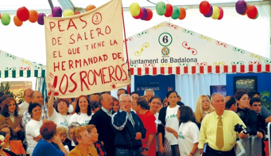Fotografia 1. L’Hermandad Nuestra Señora del Rocío Los Romeros celebra amb una graciosa pancarta en la caseta de la FECAC el seu triomf en el concurs de casetes a la Fira d'Abril de l'any 2000, a la platja de la Nova Mar Bella.