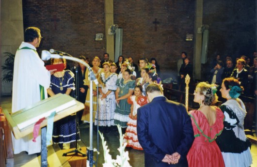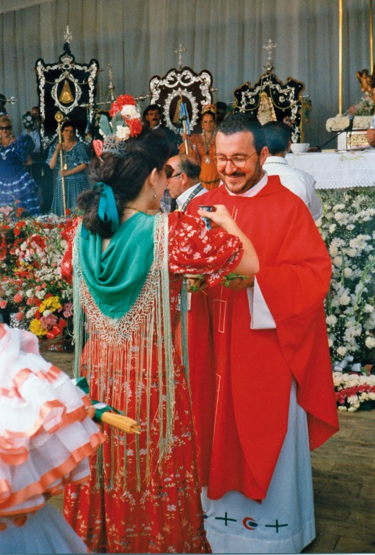 Fotografía 2. El padre José Manuel Berdala, recibiendo la ofrenda del vino de manos de Carlota, hermana de la Hdad. Ntra. Sra. del Rocío Los Romeros, en el Rocío de 1996, en Montmeló. El padre fue una figura clave en el movimiento rociero catalán, sentando sus bases litúrgicas. Para Los Romeros, fue mucho más que un consiliario.
